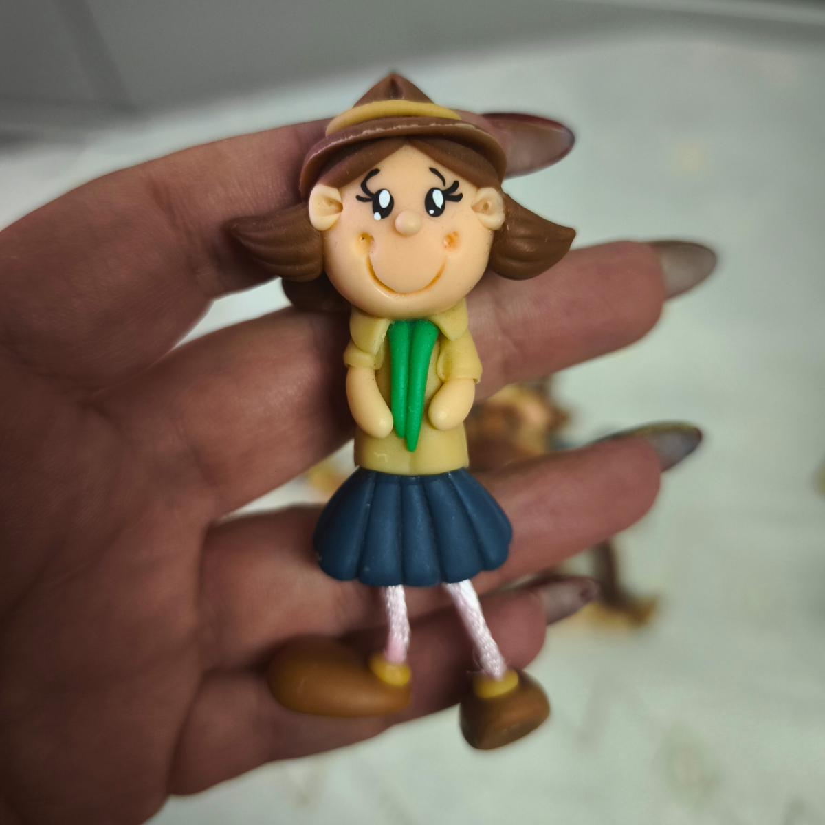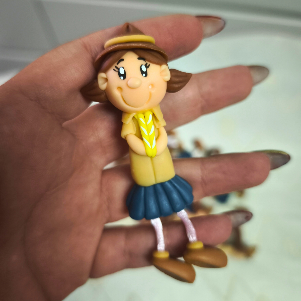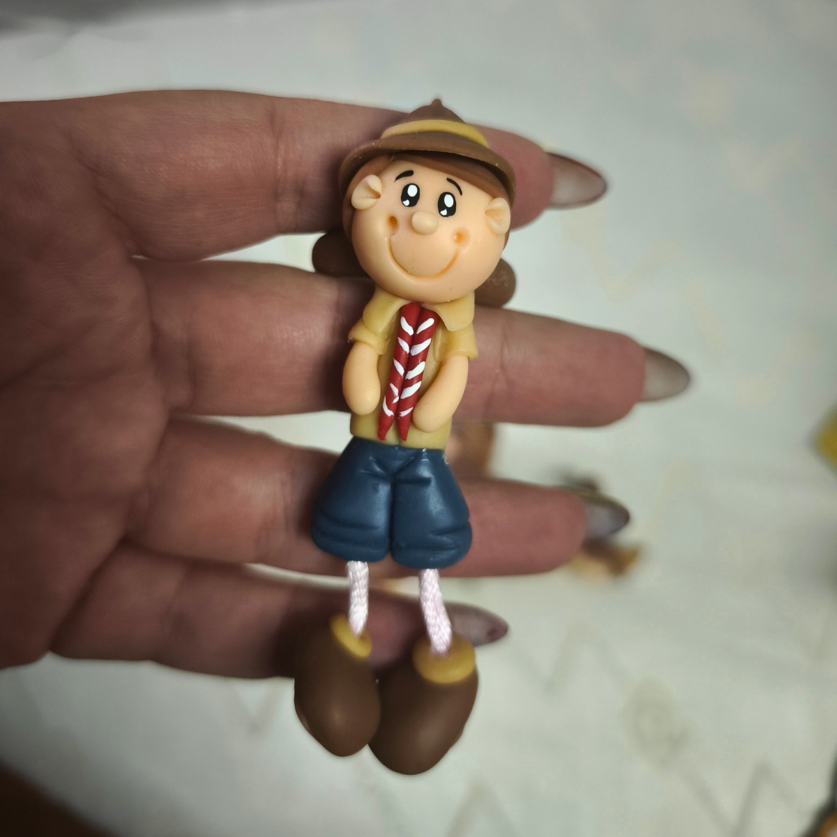 As anilhas em biscuit são delicadas e únicas, representando meninos e meninas escuteiros com os seus uniformes e lenços correspondentes a cada escalão. Estas peças são modeladas à mão, garantindo que cada anilha possui um caráter especial e individualizado. A utilização de biscuit proporciona um acabamento de qualidade, tornando-as não apenas um acessório, mas também uma lembrança significativa da experiência escuteira.