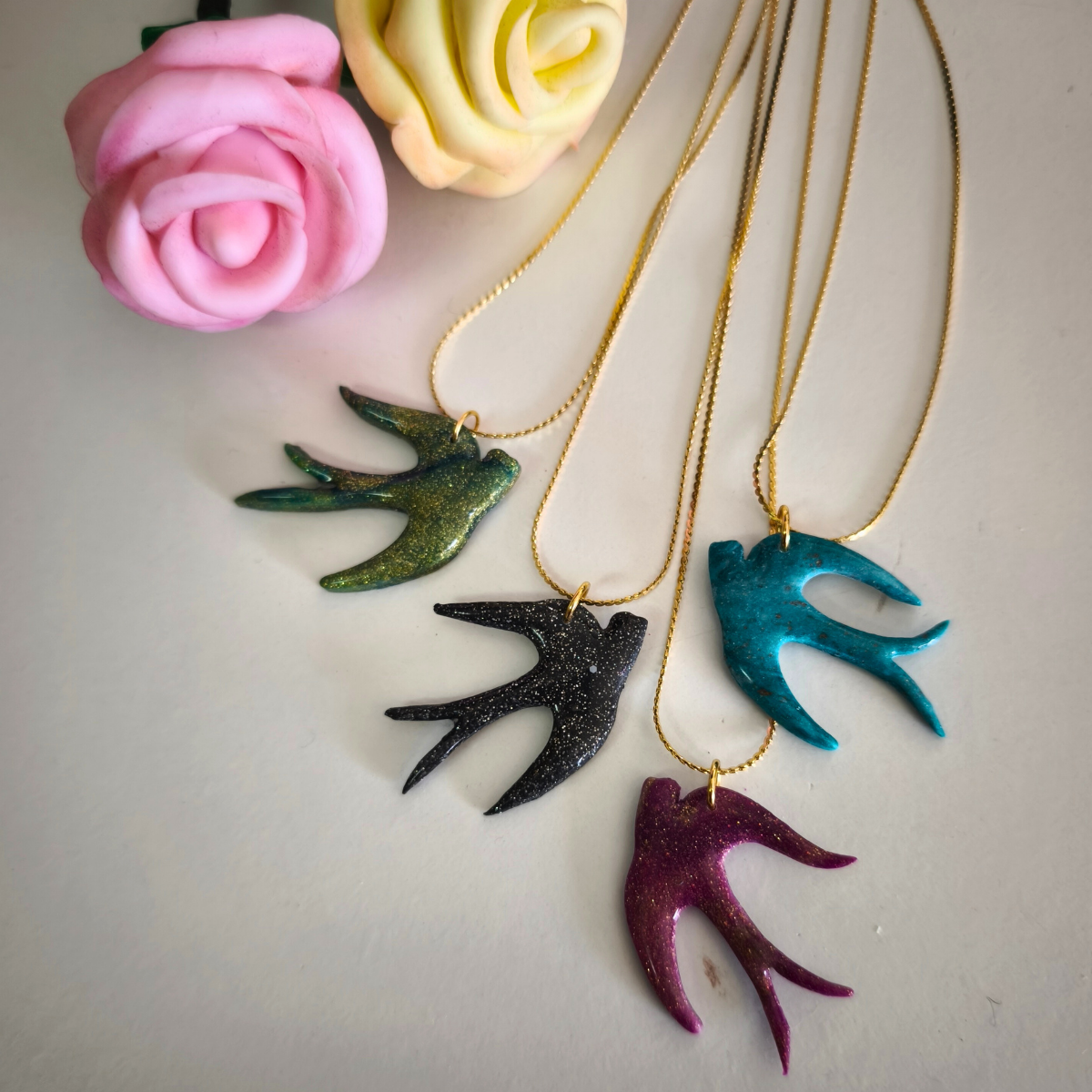 Este colar andorinha é modelado à mão em FIMO, com acabamento delicado em resina que lhe dá um toque brilhante e resistência. Uma peça leve, cheia de significado e perfeita para usar todos os dias ou para oferecer a alguém especial.