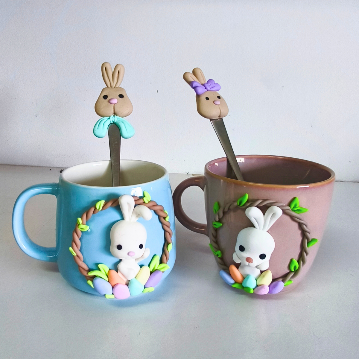 Caneca de cerâmica e colher de inox, decoradas à mão em fimo com elementos de pascoa.