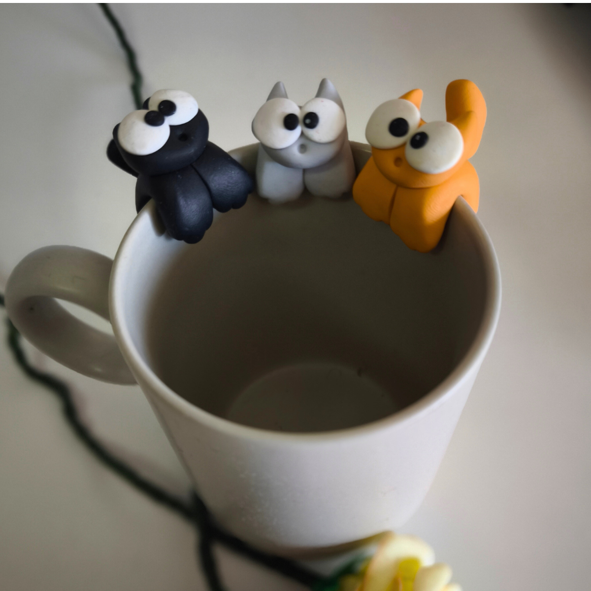 Estes gatinhos em fimo são modelados à mão e encaixam delicadamente na borda da chávena, como se estivessem a fazer companhia enquanto saboreias o teu chá e ao mesmo tempo seguram o fio da saqueta... para não andar sempre a cair!