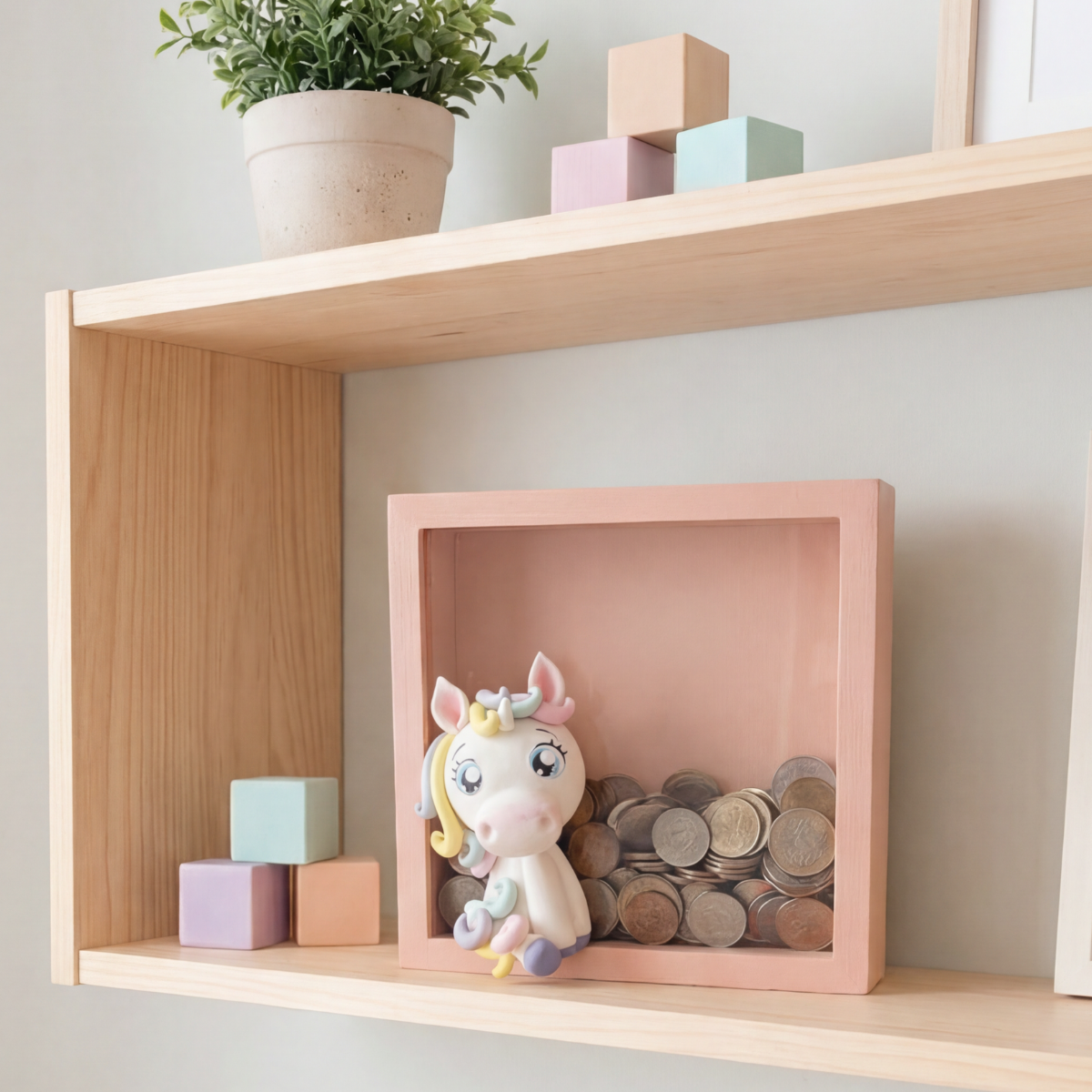 Fica no quarto, na prateleira, à vista, e continua bonito mesmo quando já não tiver moedas nenhumas.