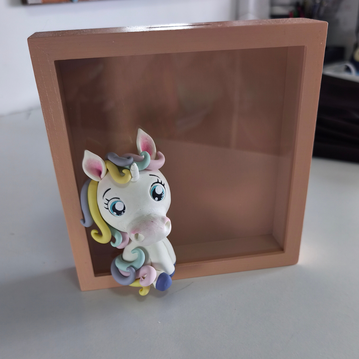 Mealheiro em madeira pintada, 18x18 cm, com unicórnio modelado à mão em biscuit.