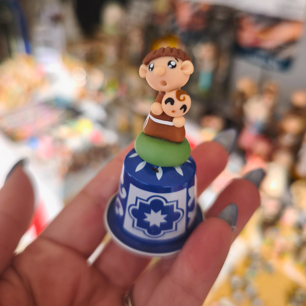 Peças decorativas inspiradas no Santo António, disponíveis em duas versões: sobre rolha ou sobre cápsula de café reutilizada.