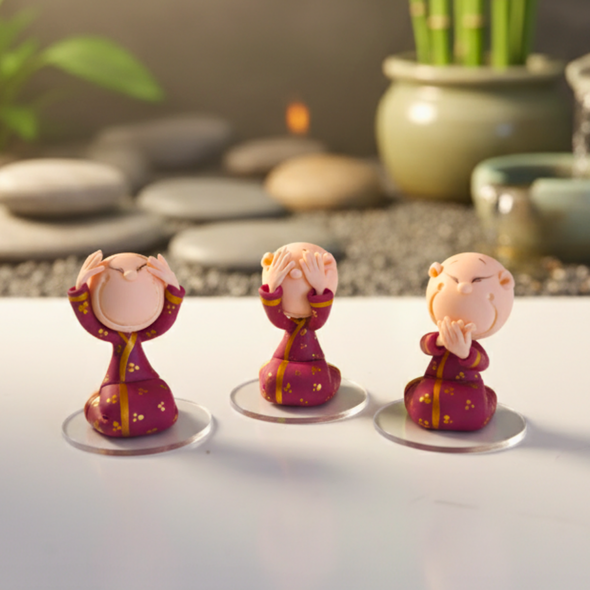 Inspirados no provérbio oriental, estes pequenos budas são um lembrete para focarmos no bem e cultivarmos a leveza do dia a dia.